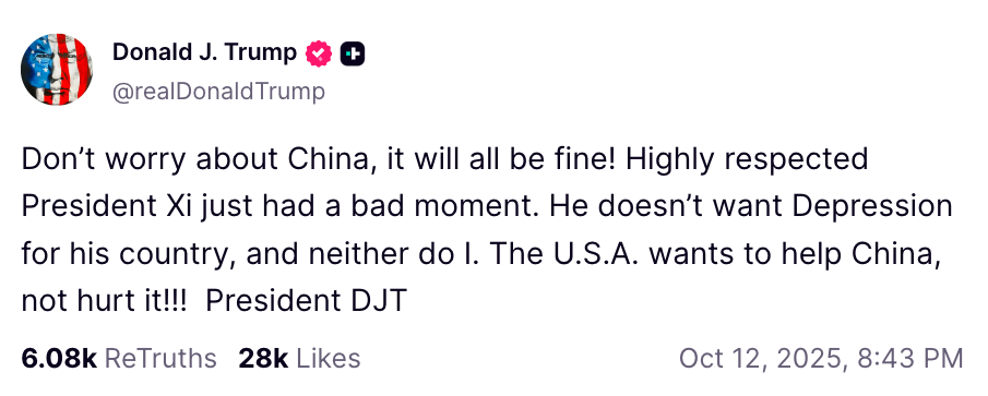 «Не беспокойтесь о Китае, все будет в порядке!» он написал в воскресенье.