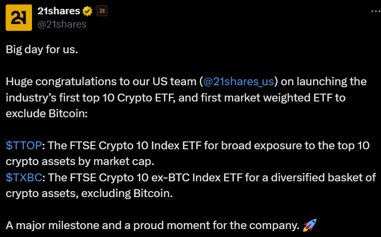 Новые продукты — 21Shares FTSE Crypto 10 Index ETF (TTOP) и 21Shares FTSE Crypto 10 ex-BTC Index ETF (TXBC) — были объявлены в четверг. Оба фонда предоставляют широкий доступ к цифровым активам, отслеживая криптовалютные индексы FTSE Russell и храня корзину из ведущих криптоактивов по рыночной капитализации вместо инвестиций в один токен.