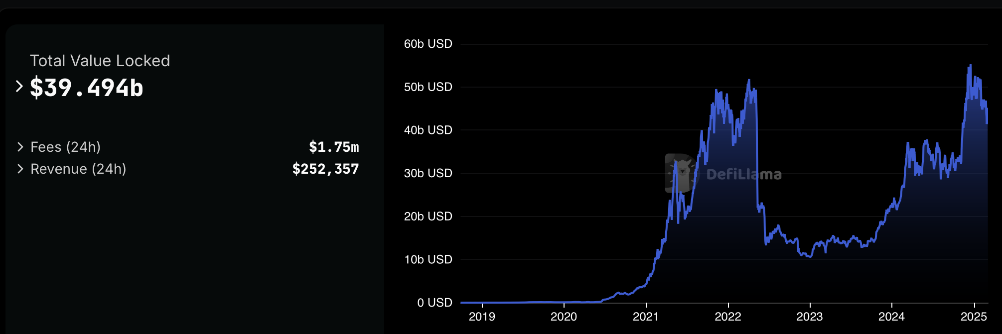 Согласно данным DefiLlama, децентрализованные финансовые (DeFi) кредитные протоколы имеют общий заблокированный объем (TVL) в размере $39,5 млрд, что больше по сравнению с $10,6 млрд на 30 декабря 2022 года. Aave, работающий на 14 блокчейнах, занимает первое место по TVL с $17,5 млрд и за последние семь дней собрал $8,3 млн в виде сборов. В январе 2025 года протокол достигнет $33,4 млрд в чистых депозитах, превысив уровни 2021 года.