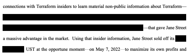 В сильно отредактированном тексте заявления утверждается, что Jane Street использовала связи с «инсайдерами Terraform», чтобы получить существенную непубличную информацию о компании, и на ее основе распродавала токены, связанные с блокчейном Terra, что ускорило падение проекта.
