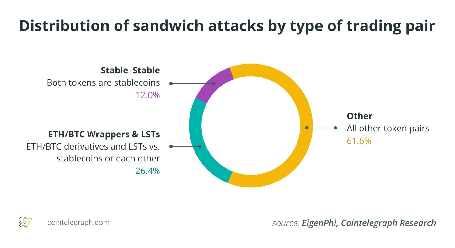 Наша информация показывает, что, несмотря на снижение извлечения сэндвич-атак, риск для обычных пользователей остается. Атаки приводят к убыткам трейдеров порядка $60 миллионов в год, при этом строители блоков захватывают большую часть этой стоимости через комиссии за газ. Злоумышленники получают прибыль лишь в размере 5%. Почти 40% всех сэндвичей происходят на пулах с низкой волатильностью, что указывает на то, что трейдеры могут сталкиваться с сильной просадкой даже на свопах, которые обычно считаются безопасными. Однако снижение извлечения может также означать, что больше трейдеров теперь используют инструменты защиты от MEV.