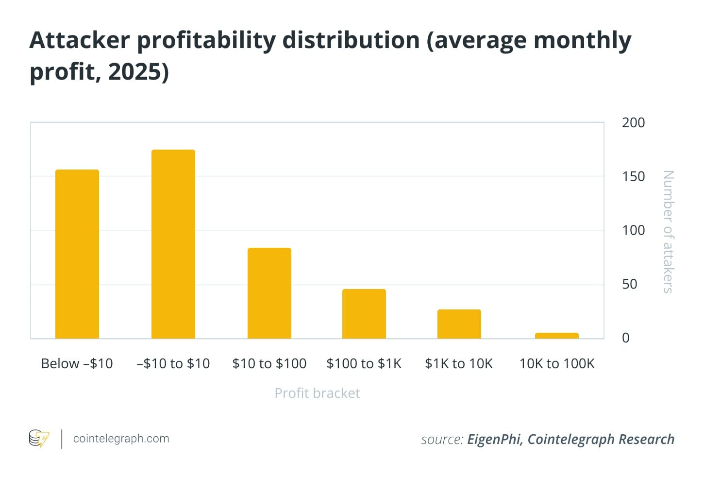 Средняя прибыль на одну сэндвич-атаку остается крайне низкой — чуть более $3. Только шесть злоумышленников заработали более $10,000 общей прибыли, что показывает, насколько узким стал путь к постоянному доходу в этой нише. Примерно одна треть всех активных сэндвич-ботов в 2025 году работала на уровне безубыточности (от -$10 до $10), тогда как около 30% зафиксировали чистые убытки. Боты часто могут нести убытки из-за высокой конкуренции за ограниченный набор возможностей, неправильно рассчитанной просадки и затрат на газ. Маржи слишком тонкие, чтобы покрыть эти ошибки.