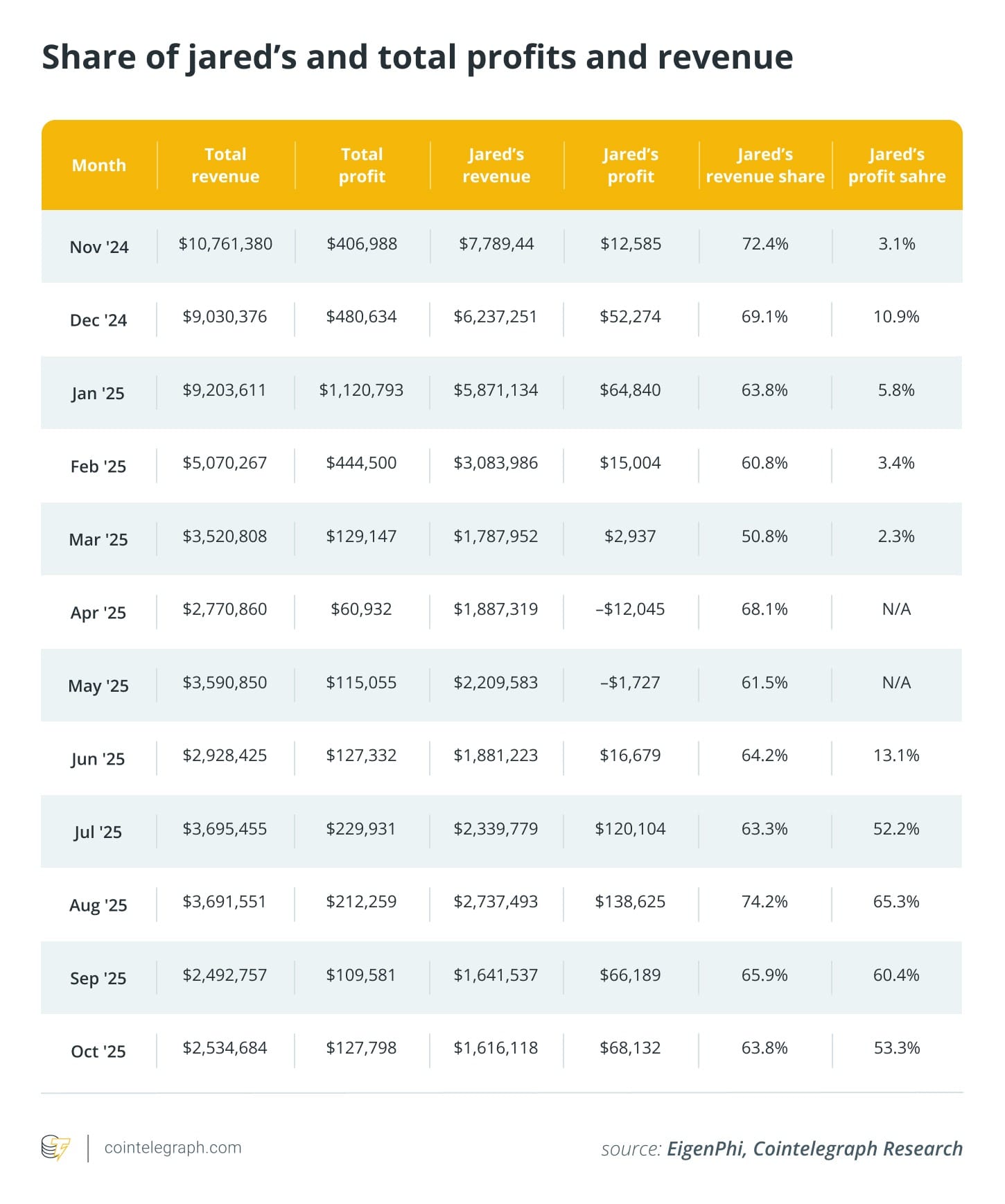 Данные показывают, что стратегия Jared оказалась самой прибыльной до сих пор. Она отдает приоритет количеству и захватывает большинство доступных возможностей сэндвича, включая меньшие, которые часто приносят прибыль всего в несколько центов. В течение большей части 2025 года затраты на газ оставались низкими относительно дохода от одной атаки, что сделало эту модель еще более жизнеспособной, чем раньше. Однако Jared иногда терпит убытки. В апреле 2025 года его маржа прибыли составила минус 20%, что привело к убыткам в размере около $12,000.