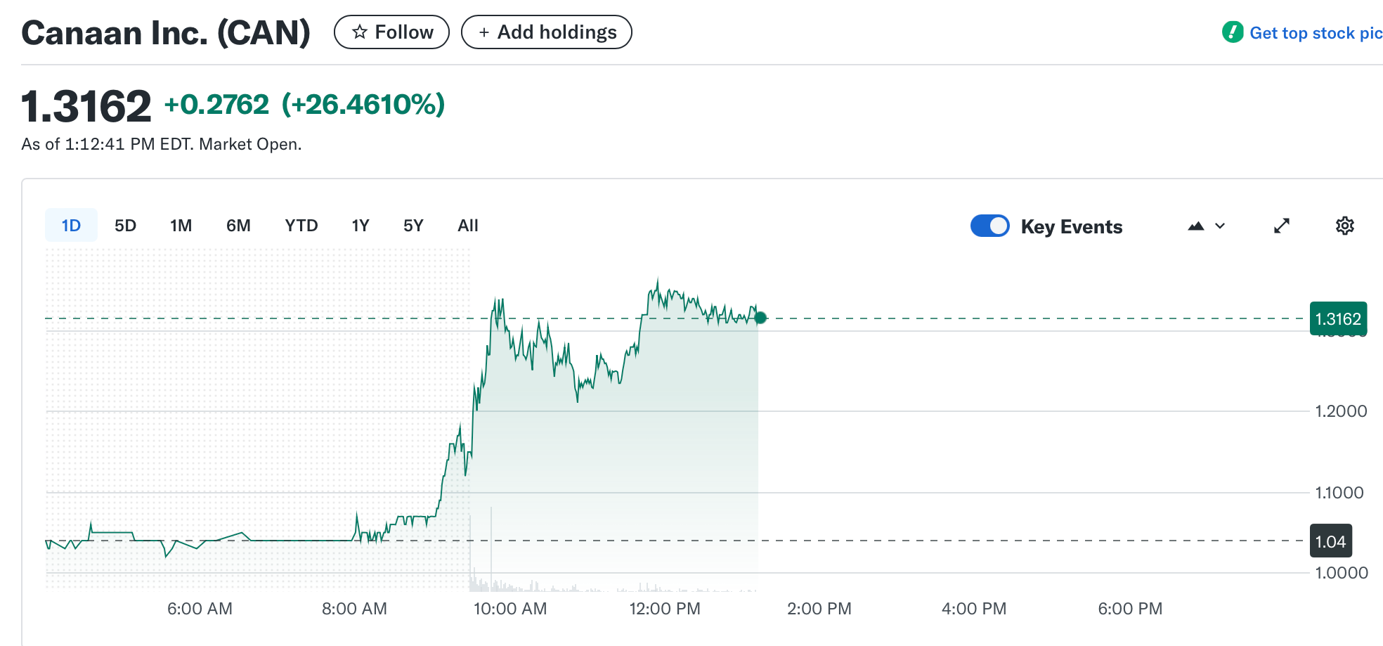 Акции Canaan, компании, занимающейся производством аппаратного обеспечения для майнинга криптовалют, основанной в Пекине в 2013 году, на момент написания статьи выросли на 26,4% до 1,31 доллара на Nasdaq, согласно Yahoo Finance