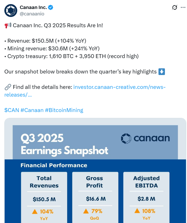 Canaan добыла 267 биткойнов (BTC) с средней выручкой 114 485 долларов за монету и увеличила свои запасы до 1 610 биткойнов к концу октября.