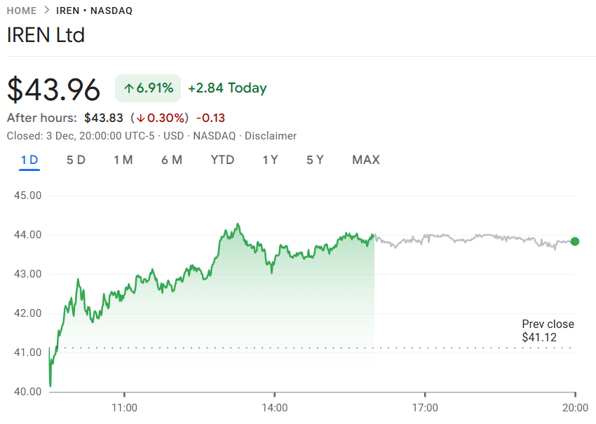 IREN (IREN) выросла на 7,6% до пика в 44,25 доллара в среду, и к закрытию торгов цена составила 43,96 доллара, увеличившись на 6,9%. Это произошло после падения на 15% во вторник из-за объявления о планах компании по сбору капитала.