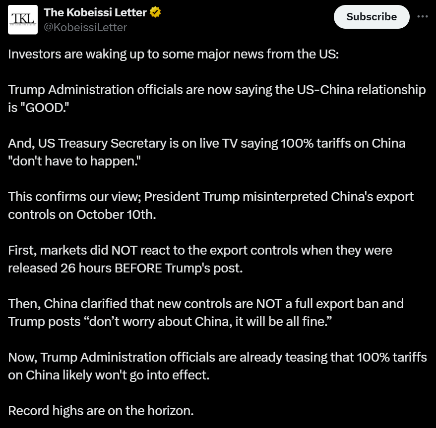 «Это подтверждает наше мнение о том, что президент Трамп неправильно интерпретировал объявленные 10 октября экспортные ограничения», — написал комментатор рынка The Kobeissi Letter, имея в виду расширение ограничений на экспорт редкоземельных минералов из Китая для оборонной и полупроводниковой промышленности.