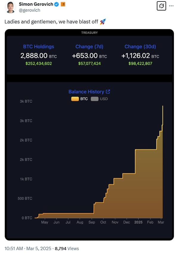 В раскрытии информации компании от 5 марта говорится, что последняя покупка увеличила ее общий запас биткойнов до 2888 BTC при средней цене покупки 84 240 долларов за монету. Запас стоит около 251 миллиона долларов, при этом биткойн торгуется около 87 150 долларов.