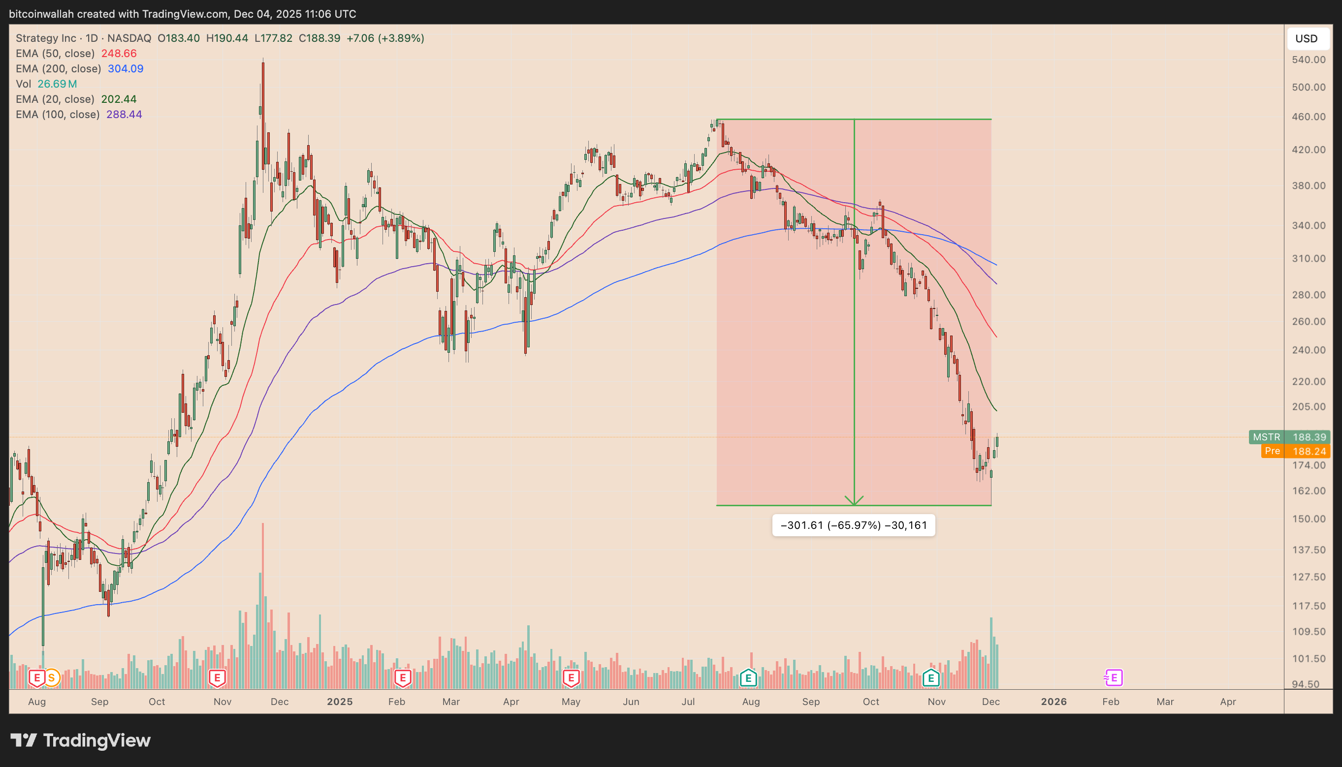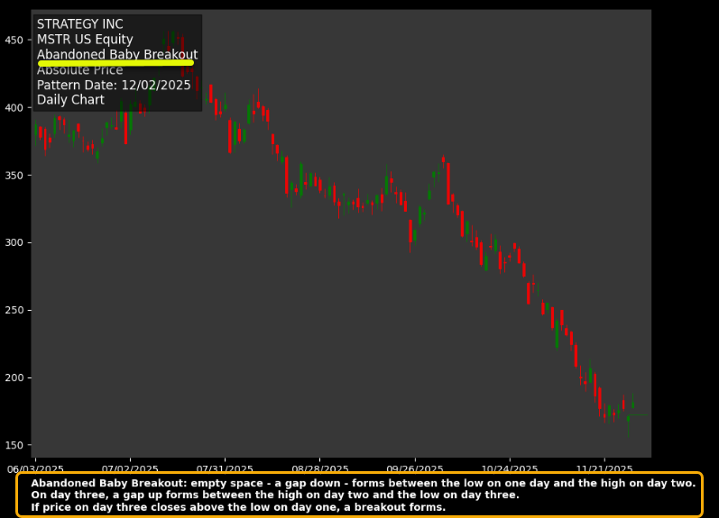 Графики MSTR начали показывать паттерн "Покинутый младенец" после продолжительного нисходящего тренда, в ходе которого его ставки упали примерно на 66% от пиков 2025 года, достигнув $155,61 в понедельник.