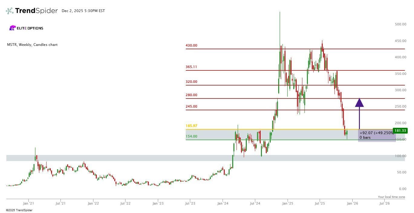 - MSTR демонстрирует редкий паттерн разворота, сигнализирующий о вероятности резкого восстановления.