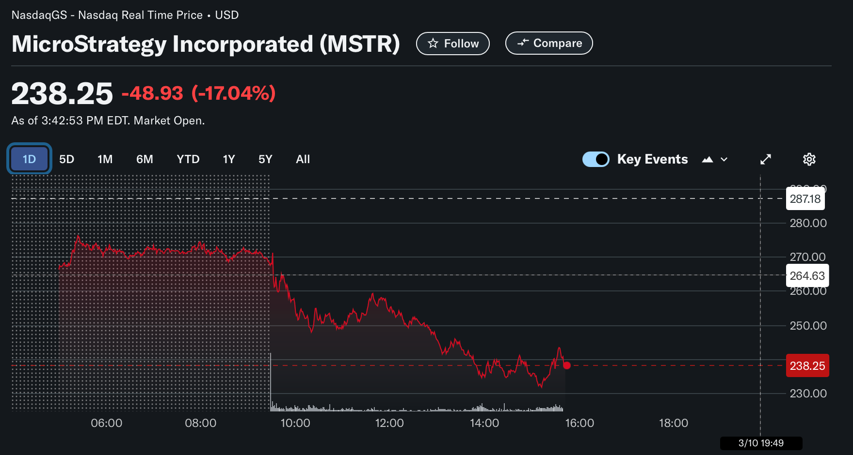 С 30 января по 10 марта акции MicroStrategy упали с 340,09 до 238,25 долларов. Это падение включает в себя снижение на 17% 10 марта на фоне более широких распродаж в технологическом секторе.