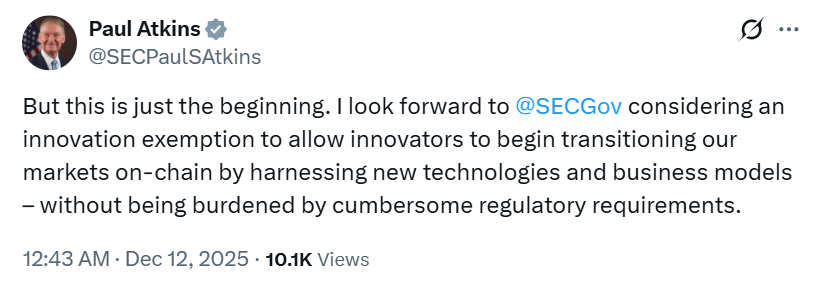 «Финансовые рынки США готовы к переходу на блокчейн», — написал Пол Аткинс, председатель Комиссии по ценным бумагам и биржам, в пятничном посте на X, добавив, что агентство принимает новые технологии для создания этого будущего на блокчейне.
