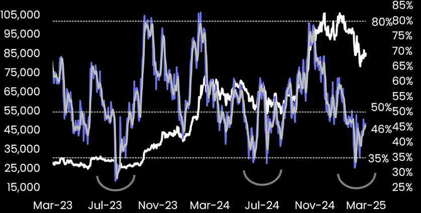 Он отметил, что эти недельные индикаторы разворота возвратились к уровням, при которых в прошлом возобновлялись бычьи рынки, как в сентябре 2023 года — благодаря рассказам о биржевых фондах на основе Bitcoin — и в августе 2024 года, когда приближались выборы в США.