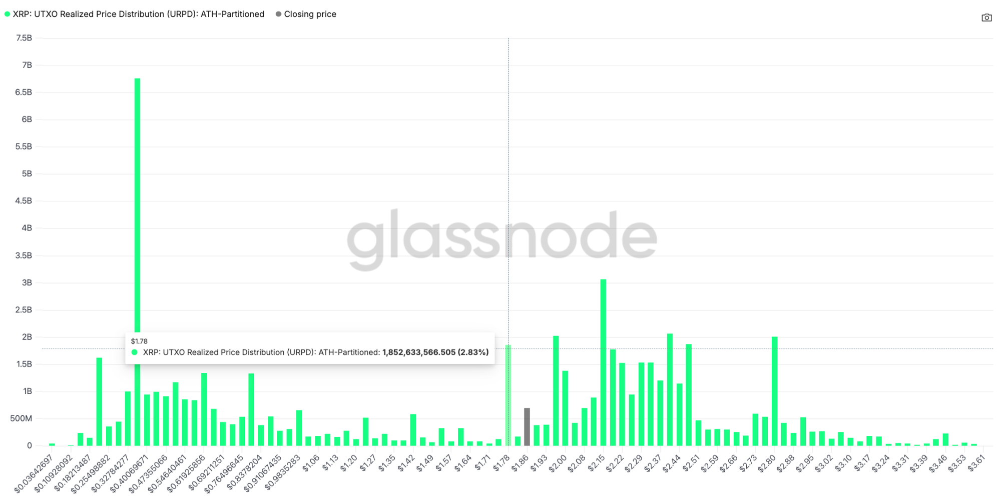 Распределение реализованной цены UTXO от Glassnode (URPD) — метрика, показывающая средние цены, по которым держатели купили свои монеты — показывает, что следующая значимая поддержка находится на уровне $1,78, где ранее было приобретено примерно 1,85 миллиарда XRP.