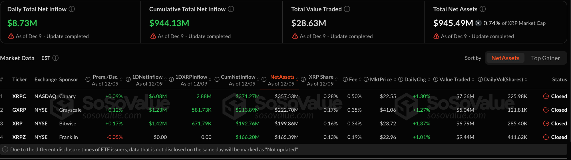 Эти инвестиционные продукты привлекли более $944 миллионов в виде XRP с момента выхода на рынок 13 ноября, согласно данным SoSoValue. Теперь ETF владеют около 0.74% всех циркулирующих XRP, что впечатляет для фондов, существующих менее месяца.