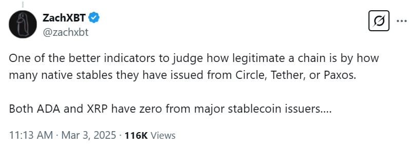 3 марта ZachXBT утверждал, что присутствие стейбл коинов, выпускаемых Circle, Tether и Paxos, является сильным индикатором легитимности блокчейна. Он отметил, что ни Cardano, ни XRP Ledger в настоящее время не содержат значительных запасов стейбл коинов.