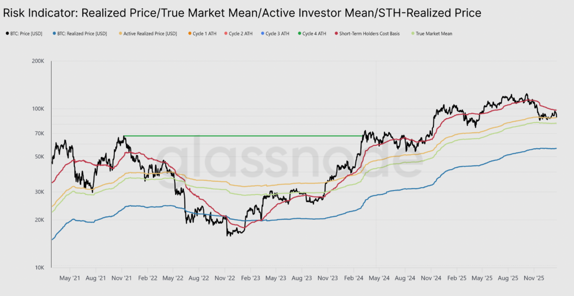 Пара BTC/USD колеблется в широком диапазоне между уровнем True Market Mean около $81 100 и уровнем себестоимости краткосрочных держателей (STH) около $98 400.