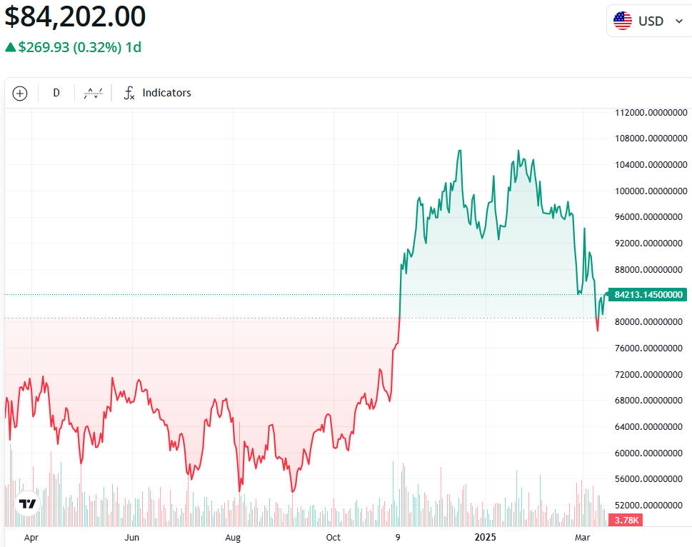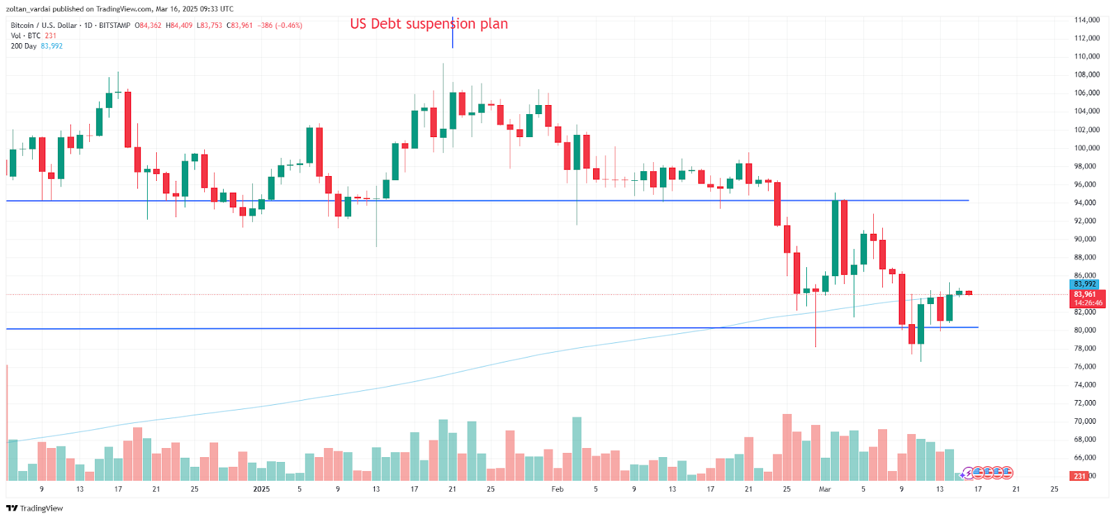 В оптимистичном ключе биткоин закрылся выше $84,000 15 марта впервые более чем за неделю с 8 марта, показывают данные TradingView.
