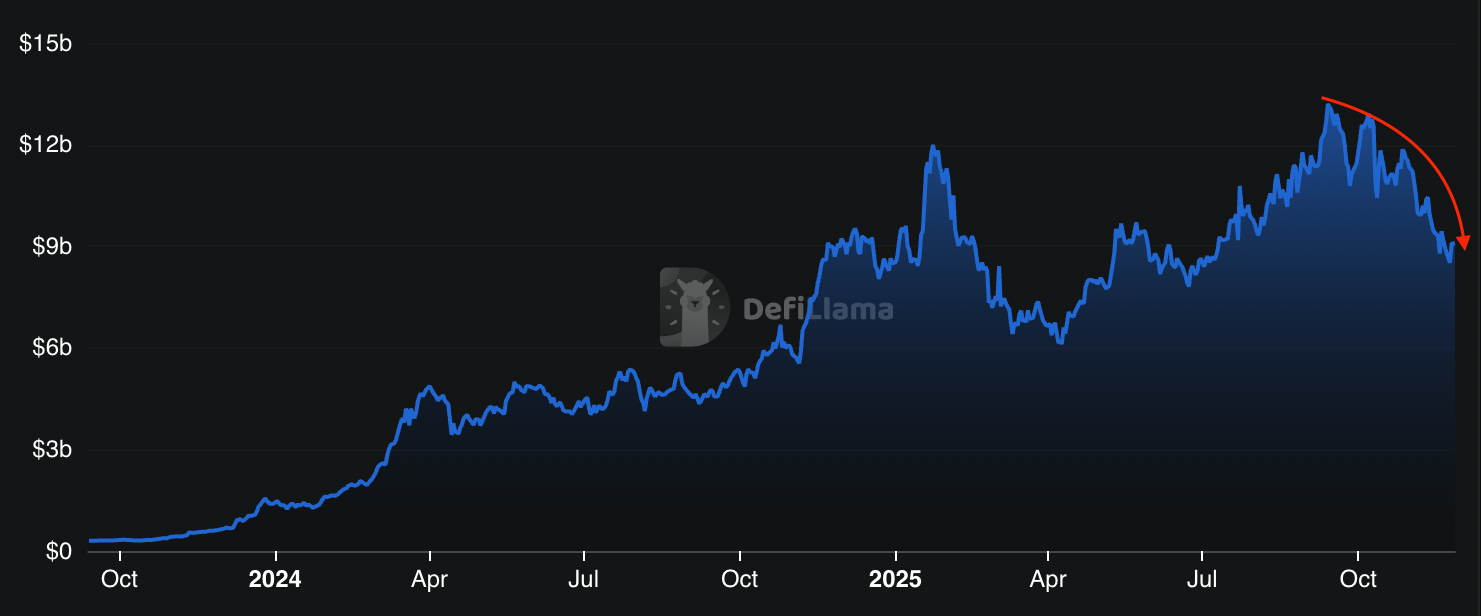 Точно так же общий заблокированный объем (TVL) Solana снизился на 20% с начала месяца и упал на 32% с сентябрьского максимума в $13,23 млрд до $9,1 млрд на 11 ноября.