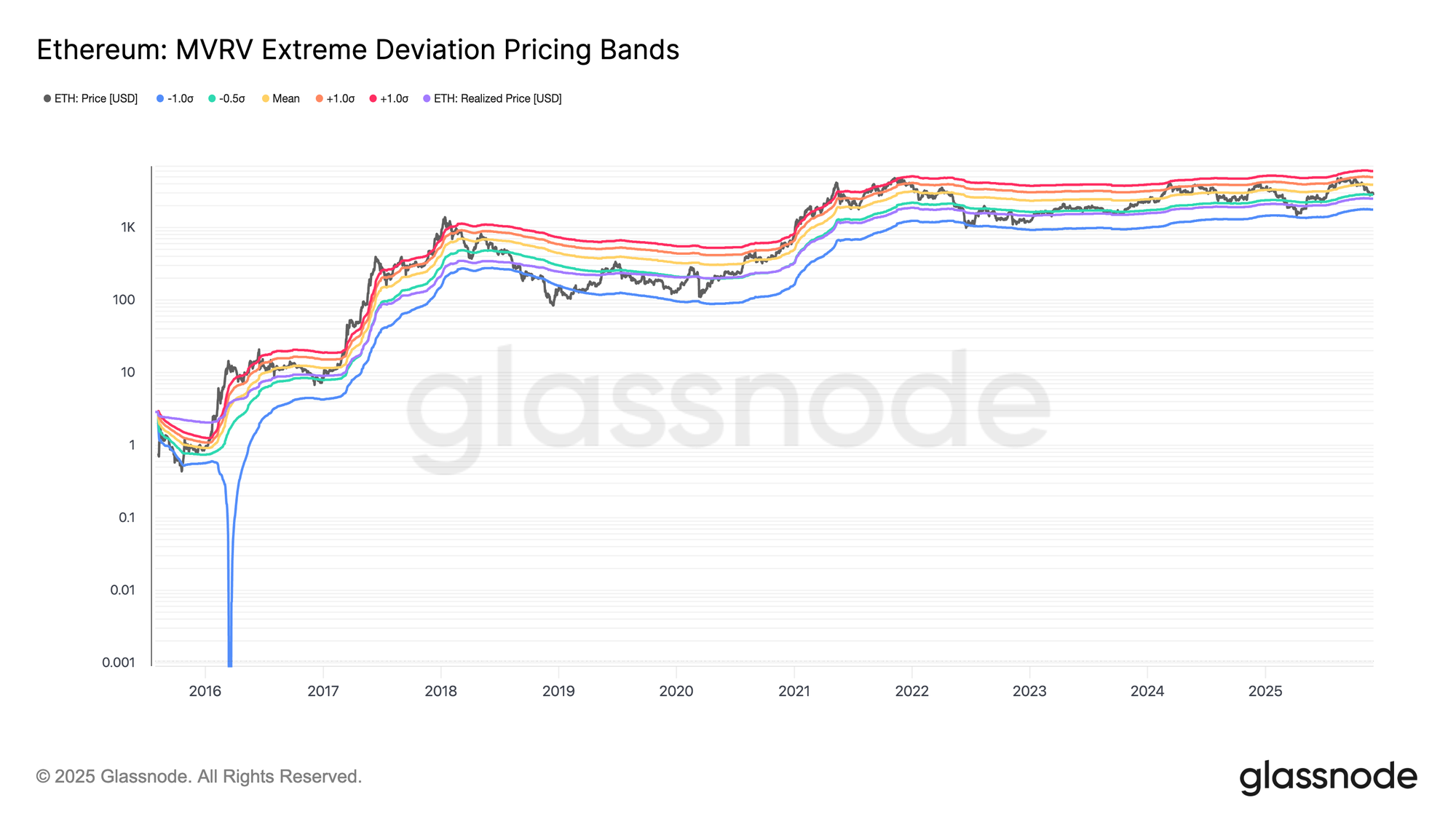 По данным на вторник, Эфир повторно тестировал свою −0.5σ полосу отклонения MVRV (бирюзовая), находящуюся в районе $2820–$2830, в качестве поддержки второй раз за неделю, как показывают данные Glassnode.