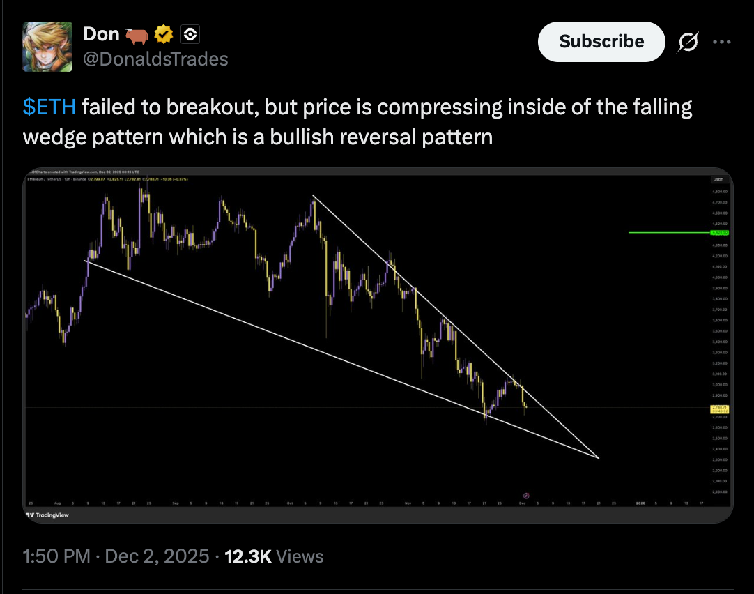 Нисходящие клинья обычно приводят к прорывам, однако это может указывать на формирование локального дна ETH в районе $2200-2220 в декабре.