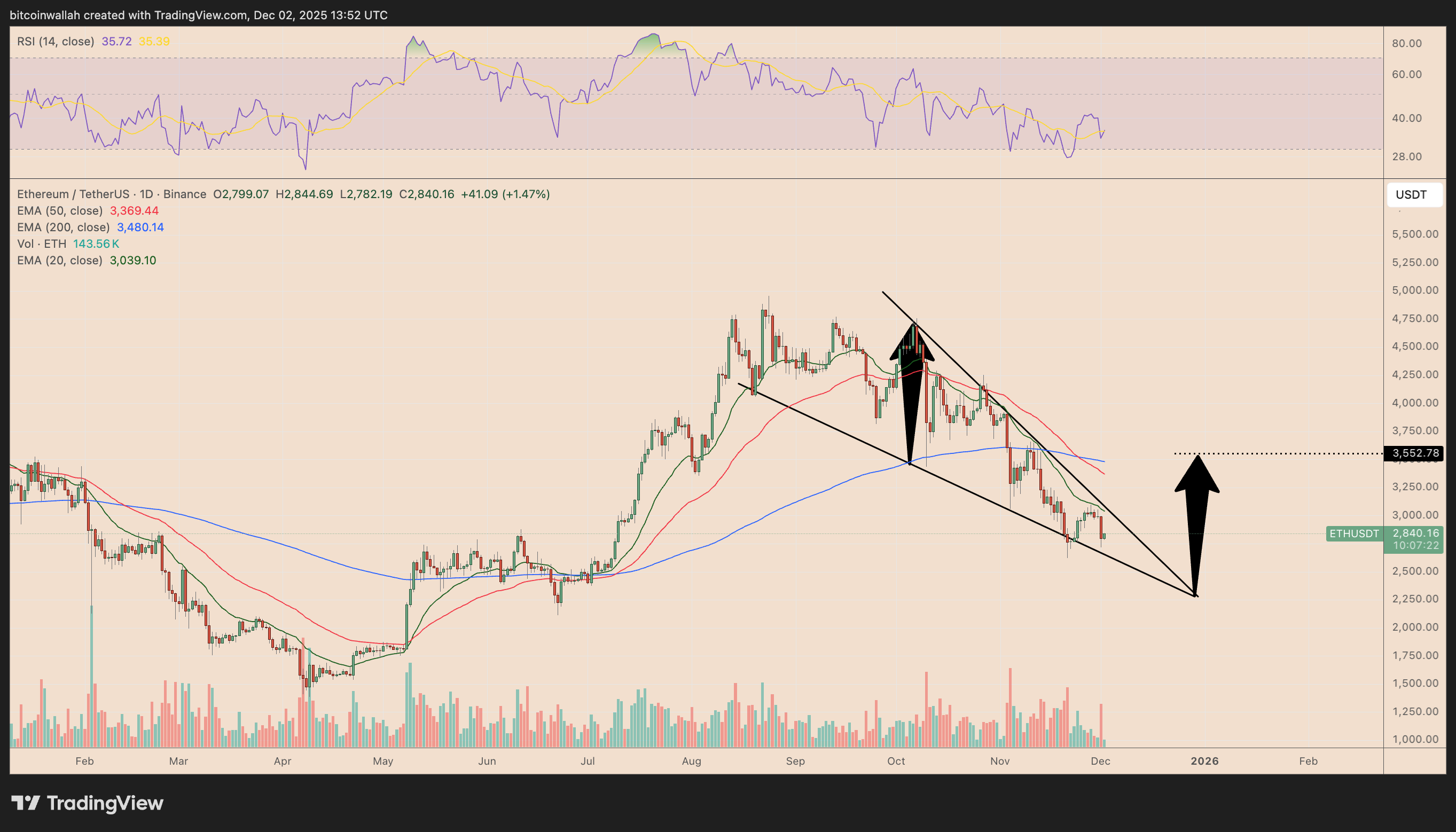 ETH может вырасти до $3550 перед новым годом, если цена пробьется выше верхней линии клина, как показано ниже.