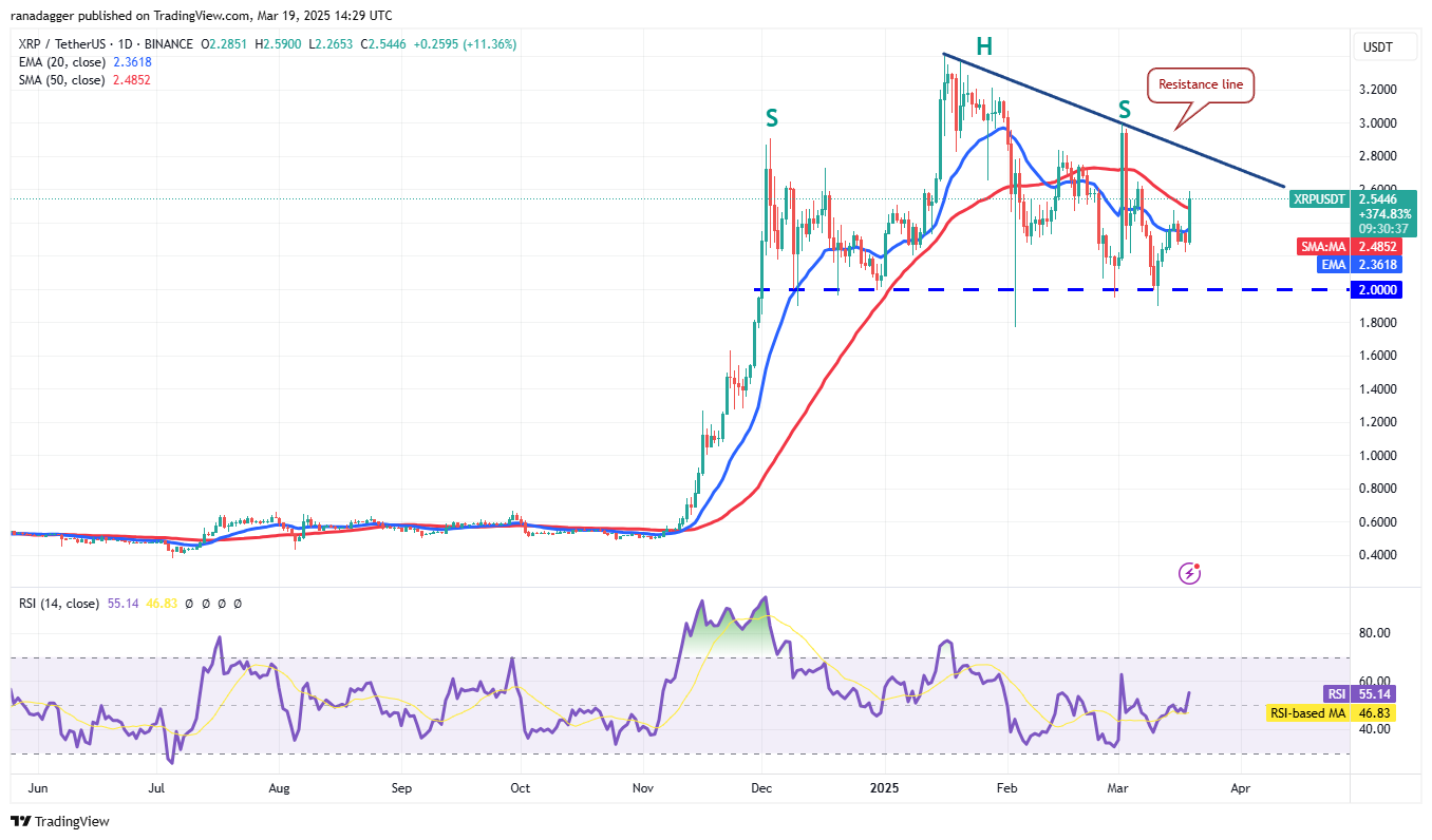 Если цена снизится от линии сопротивления, пара XRP/USDT, вероятно, найдет поддержку на 20-дневной EMA ($2.36). Отскок от 20-дневной EMA увеличивает вероятность прорыва выше линии сопротивления. Пара затем может подняться до $3.