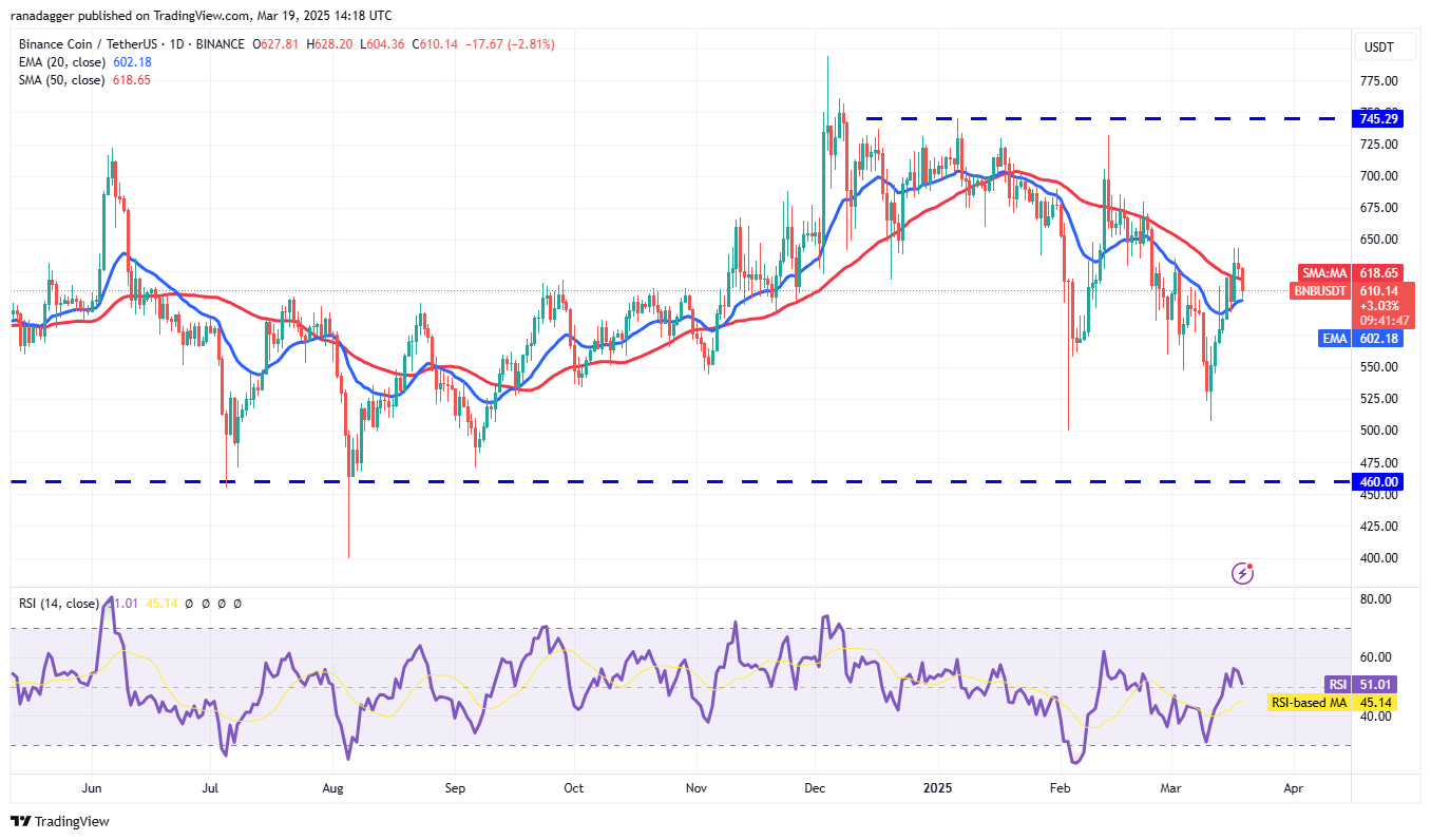 BNB закрылся выше 50-дневной SMA ($618) 17 марта, но быки испытывают трудности с удержанием более высоких уровней.