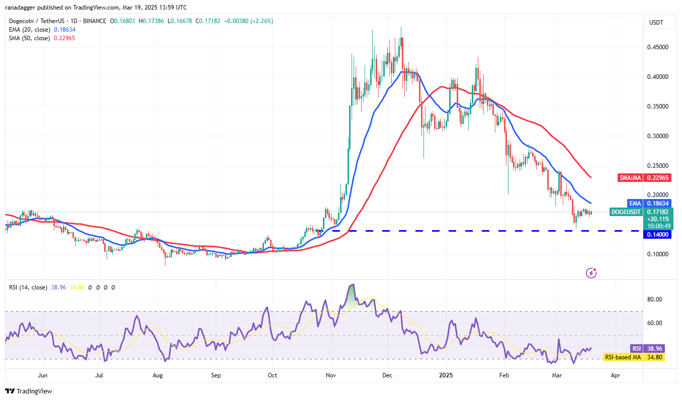 Dogecoin (DOGE) столкнулась с продажами возле 20-дневной EMA ($0.18), что говорит о наличии активности медведей на более высоких уровнях.