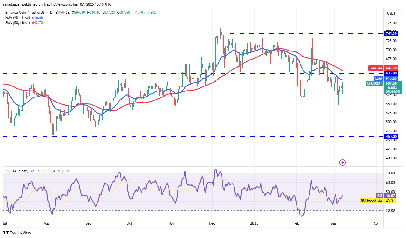 BNB (BNB) отклонился от 20-дневной EMA ($616) 6 марта, но положительным моментом является отсутствие значительного отката от быков.