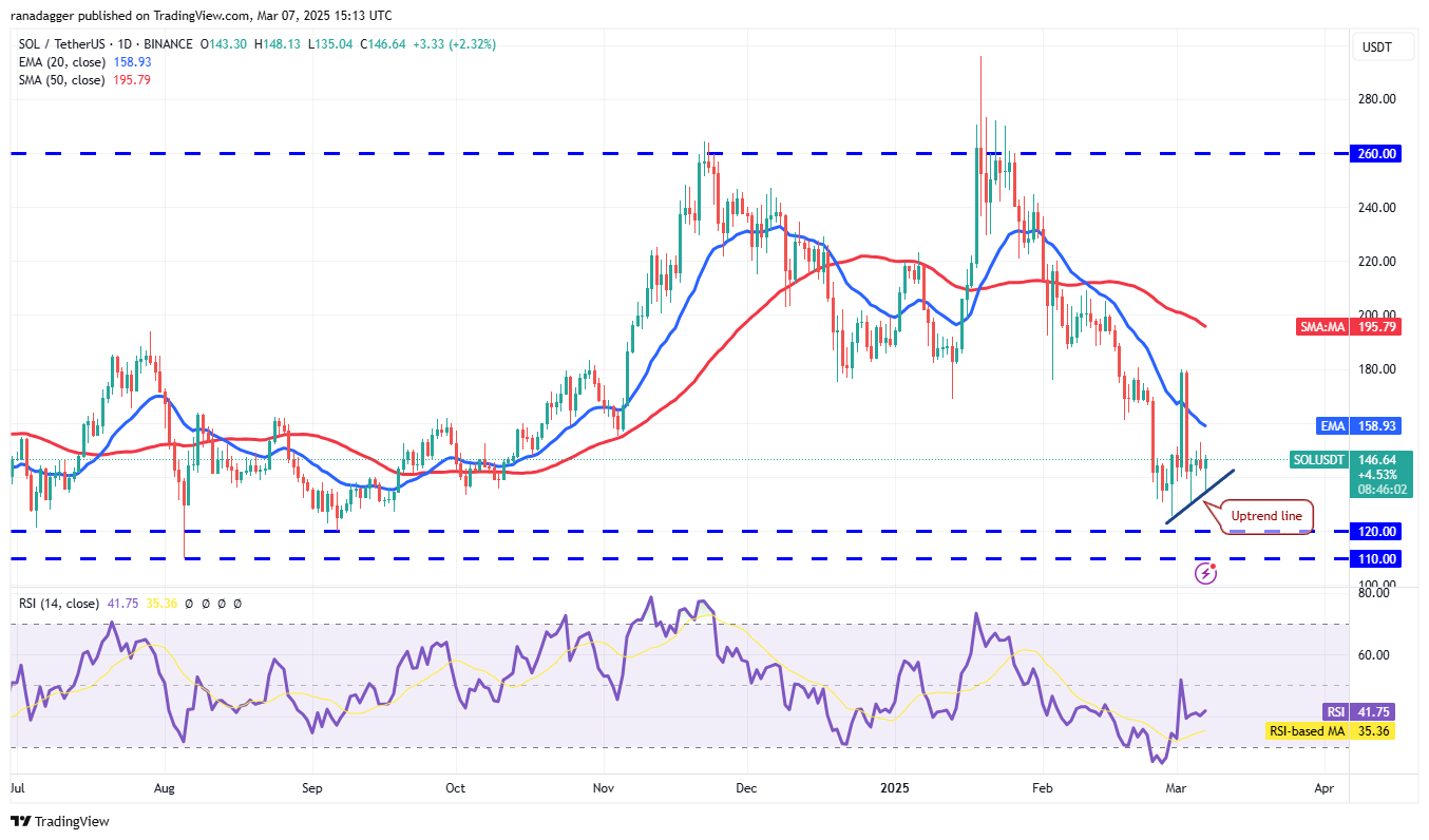 Ключевое сопротивление сверху, на которое следует обратить внимание, — это 20-дневная EMA ($158). Если покупатели преодолеют это препятствие, пара SOL/USDT может подняться до $180. Ожидается, что продавцы будут активно защищать уровень $180, так как его пробой может указывать на завершение коррекции. Затем пара может подняться до $220.
