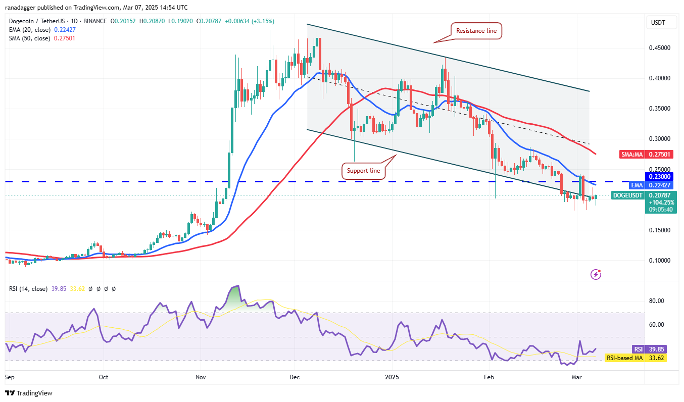 Покупатели пытались начать восстановление в Dogecoin (DOGE), но столкнулись с активными продажами со стороны медведей на уровне 20-дневной EMA ($0.22) 6 марта.