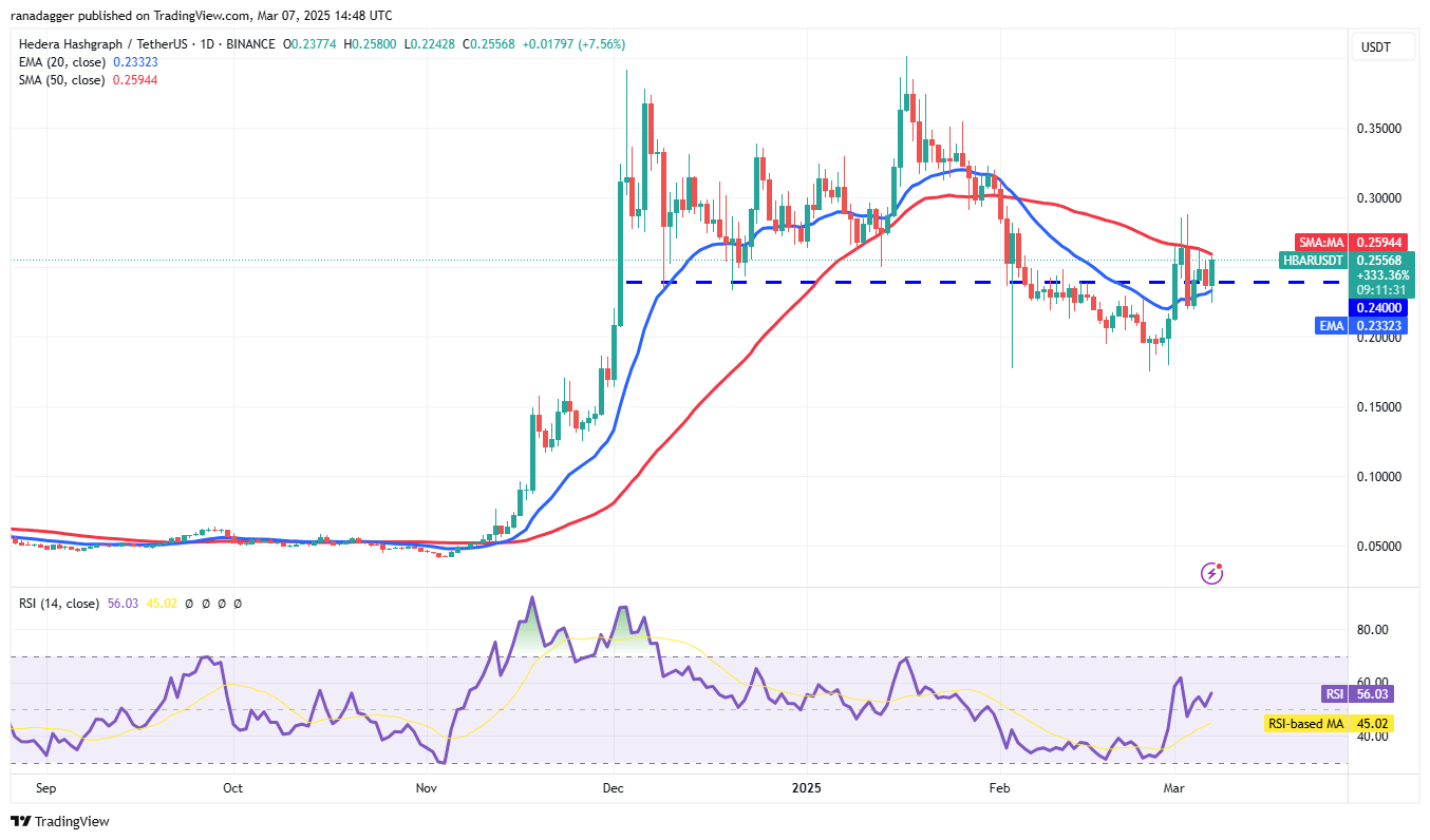 Если покупатели поднимут цену выше 50-дневной SMA ($0.26), пара HBAR/USDT может подняться до $0.29. Это краткосрочное сопротивление, на которое следует обратить внимание, так как его пробой будет указывать на завершение коррекции. Пара может затем вырасти до $0.35.