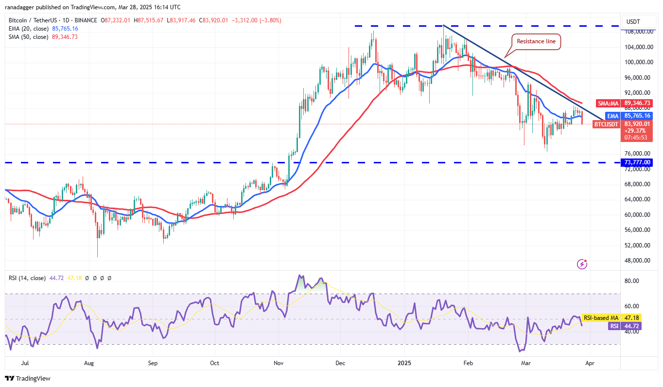 Bitcoin снизился от линии сопротивления и пробил 20-дневную экспоненциальную скользящую среднюю ($85,765) 28 марта.