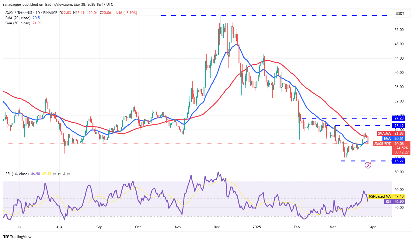 20-дневная EMA ($20.51) — ключевая поддержка, за которой следует следить. Если цена закроется ниже 20-дневной EMA, пара AVAX/USDT может скатиться до $18. Ожидается, что покупатели защитят уровень в $18, но если медведи возьмут верх, пара может протестировать критическую поддержку на $15.27.