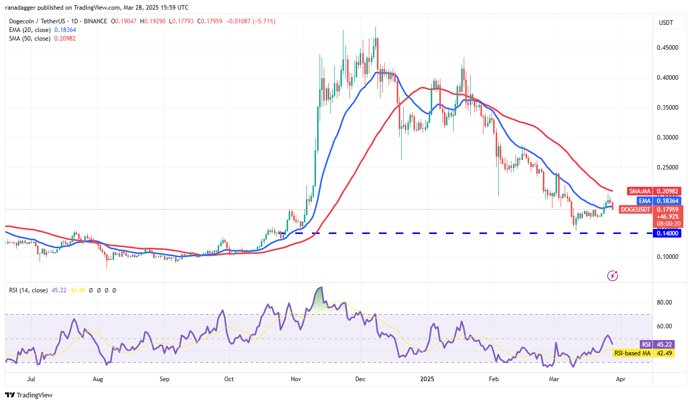 Цена Dogecoin (DOGE) снизилась с 50-дневной SMA ($0.21) 26 марта, что свидетельствует о негативных настроениях.