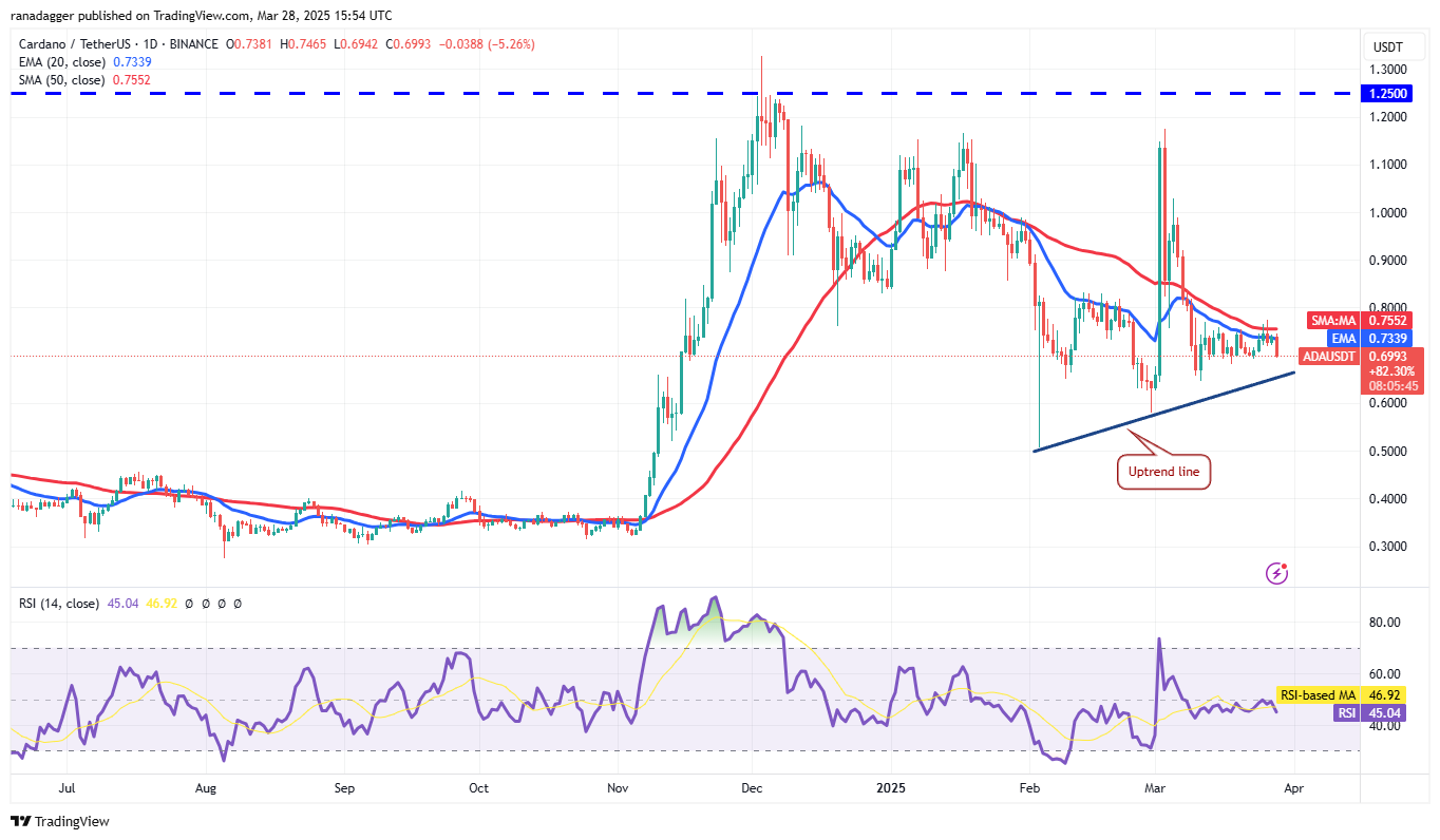 Пара ADA/USDT может скатиться до линии восходящего тренда, где ожидается, что покупатели вступят в игру. Если цена отскочит от линии восходящего тренда, быки снова попытаются поднять пару выше 50-дневной SMA. Если они добьются успеха, пара может вырасти до $0.84 и затем до $1.02.