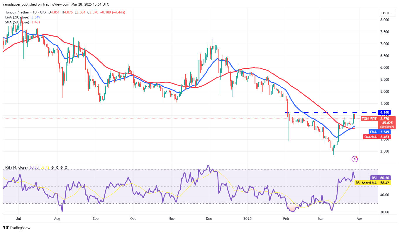 Toncoin (TON) развернулся от 20-дневной EMA ($3.54) 26 марта и достиг верхнего сопротивления в $4.14 27 марта.