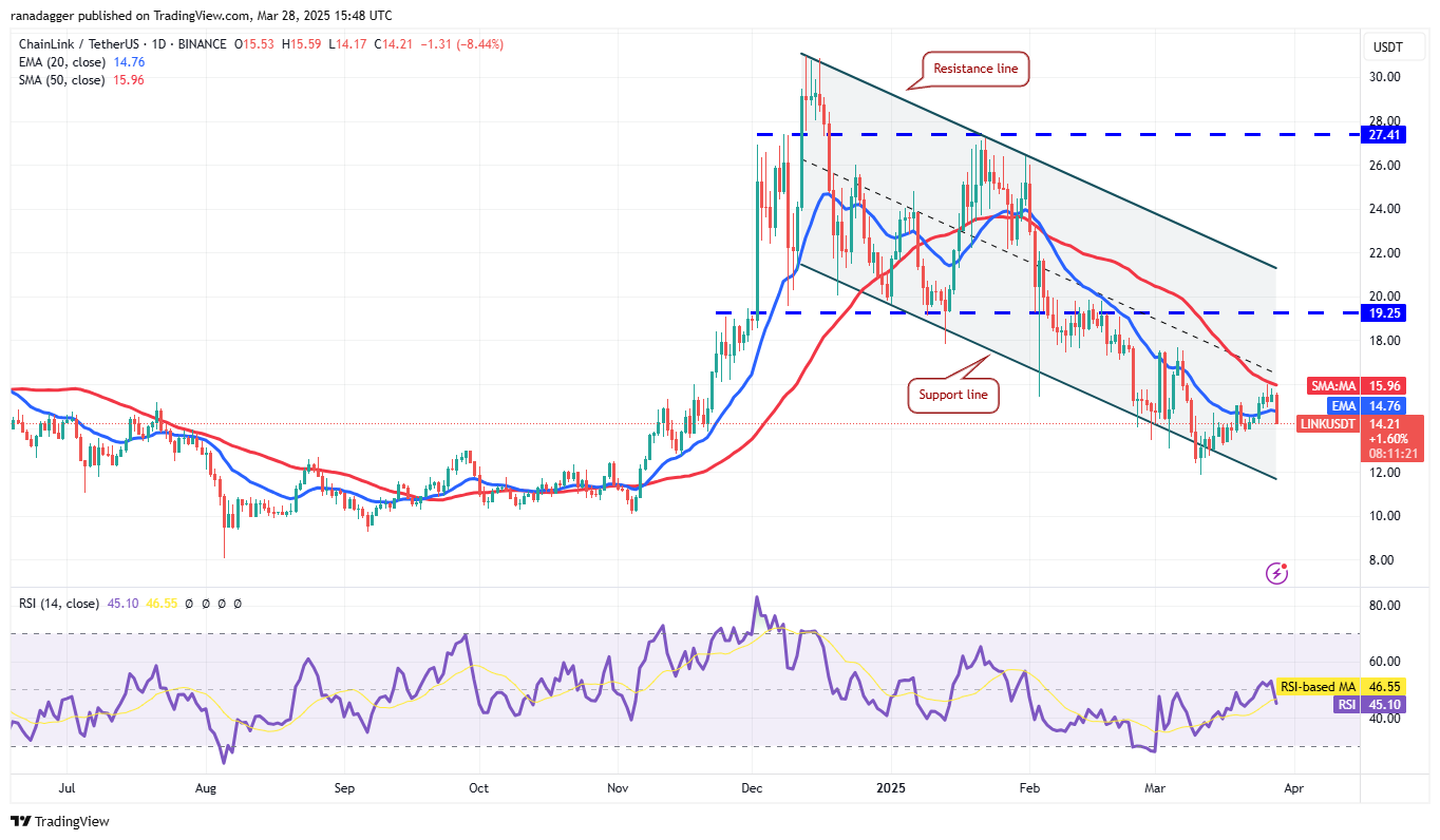 Цены Chainlink (LINK) снизились с 50-дневной SMA ($15.96) 28 марта и пробили 20-дневную EMA ($14.76), что указывает на продажи медведей на росте.