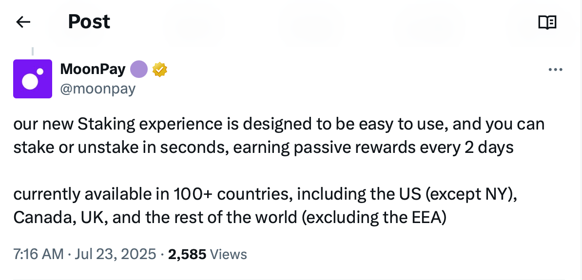 В июле платформа крипто финтеха MoonPay вышла на рынок, объявив о запуске программы ликвидного стейкинга Solana, предлагая пользователям годовую доходность до 8,49% на их активы SOL.