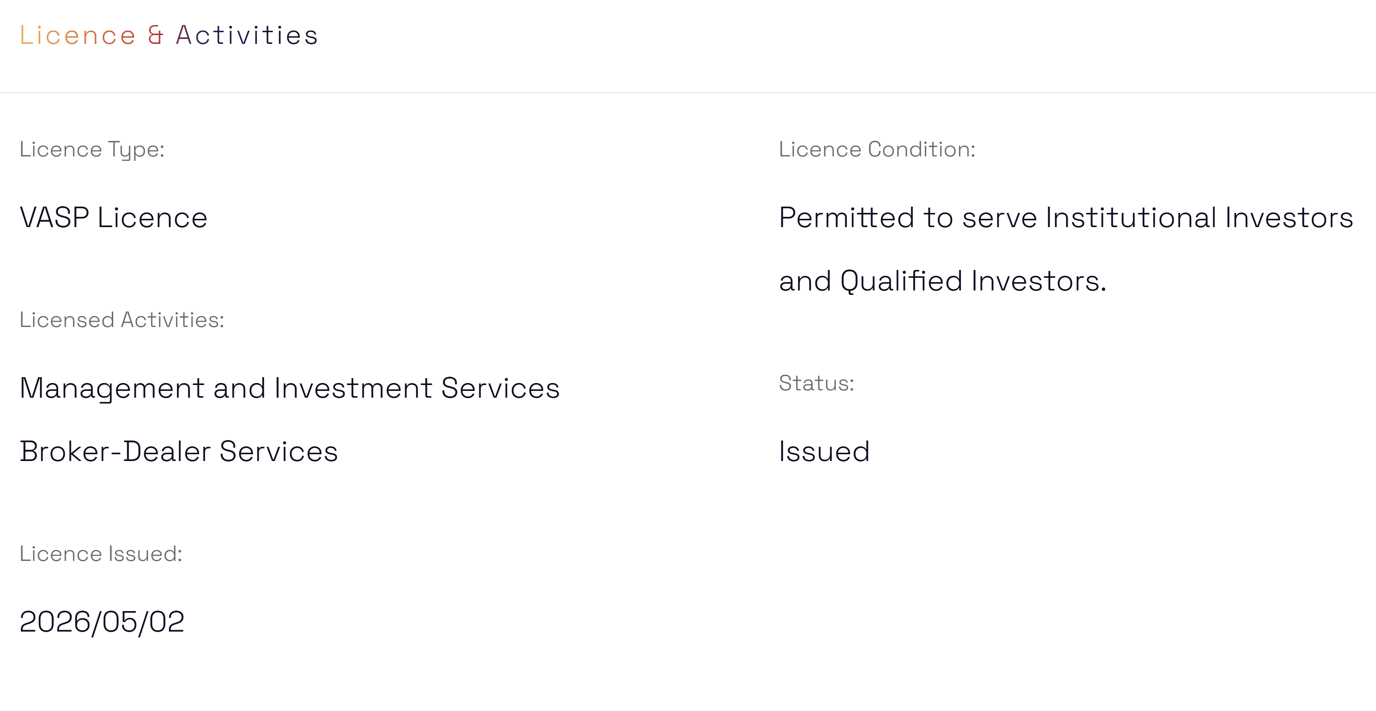 Согласно заявлению компании, лицензия позволяет основанному в Гонконге Web3-инвестору и разработчику платформ оказывать брокерско-дилерские услуги и заниматься инвестиционным управлением, связанным с виртуальными активами, в Дубае и из Дубая, за исключением Дубайского международного финансового центра (DIFC). Услуги ориентированы прежде всего на институциональных и квалифицированных инвесторов по всему миру.