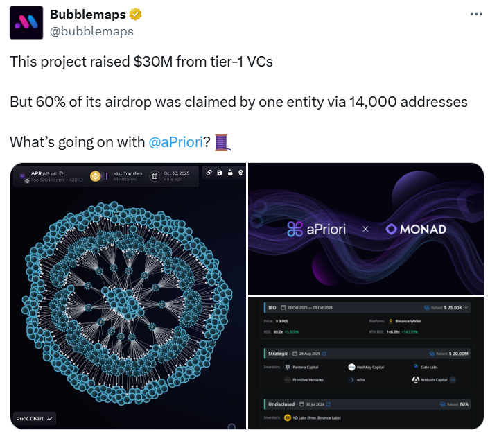 По данным аналитической платформы блокчейна Bubblemaps, около 60% токенов aPriori (APR), выделенных в рамках последнего airdrop, были получены одним лицом через 14 000 взаимосвязанных кошельков криптовалюты.