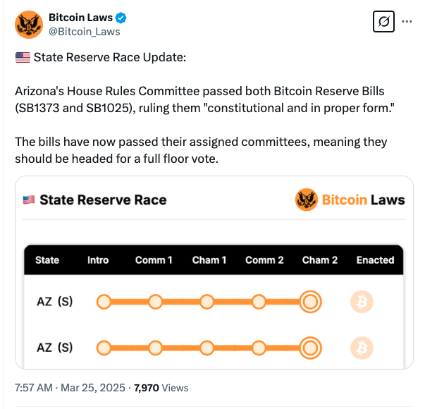 Недавно утвержденные Комитетом правил Палаты представителей штата Аризона два законопроекта — это Закон о стратегическом резерве цифровых активов (SB 1373) и Акт о стратегическом резерве биткойнов в Аризоне (SB 1025).