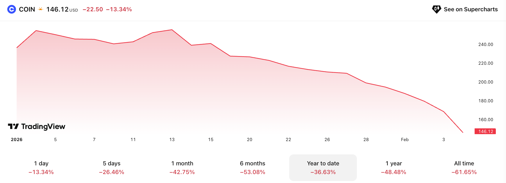 С момента дебюта на бирже в апреле 2021 года акции Coinbase подешевели примерно на 60% — с цены открытия $381, по данным Nasdaq.