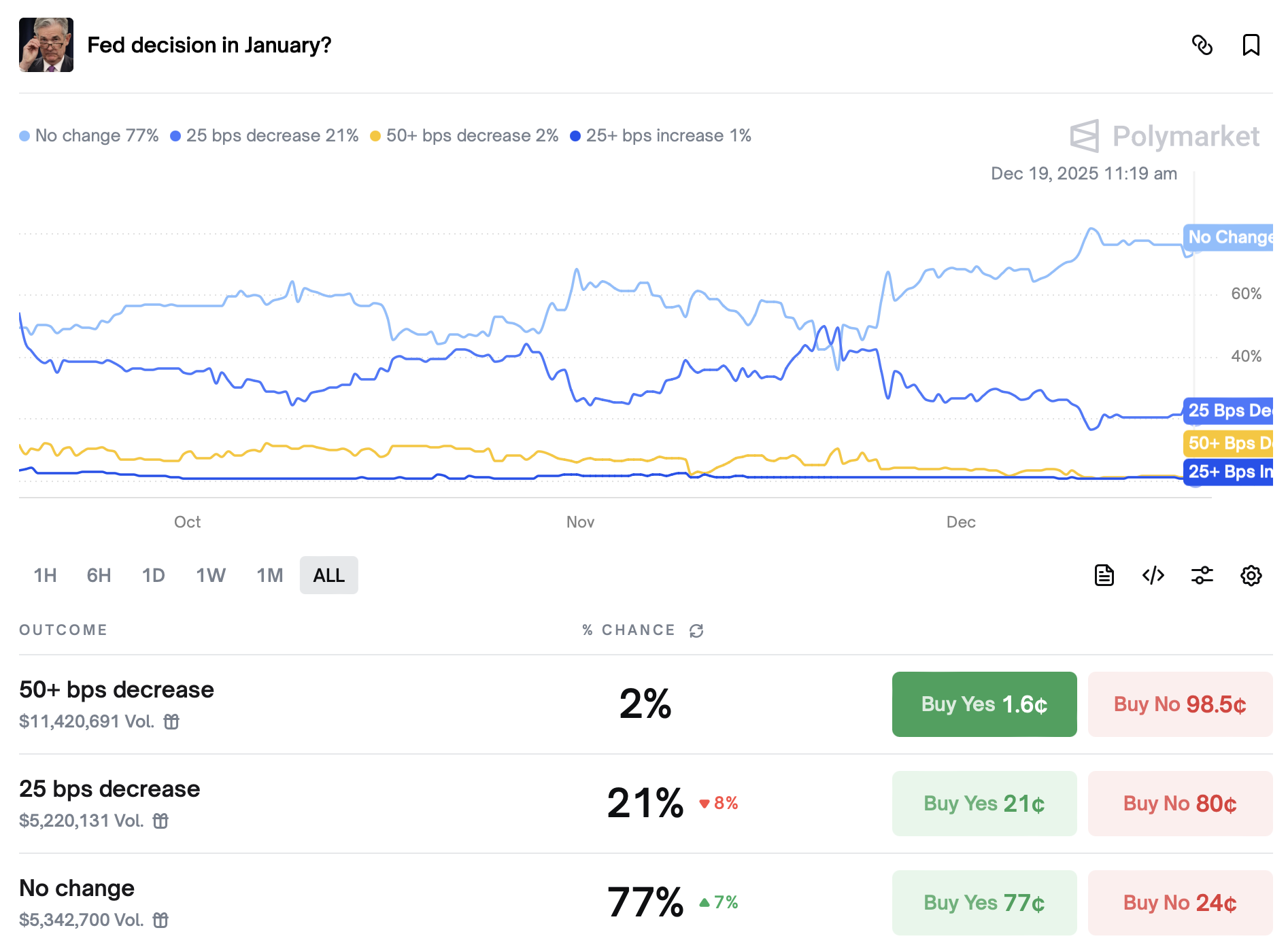 На момент написания, трейдеры Polymarket прогнозировали отсутствие изменений в политике ФРС в январе с вероятностью около 77%, в то время как шансы на очередное снижение на 25 базисных пунктов составили около 21%, а более крупные изменения считались маловероятными.