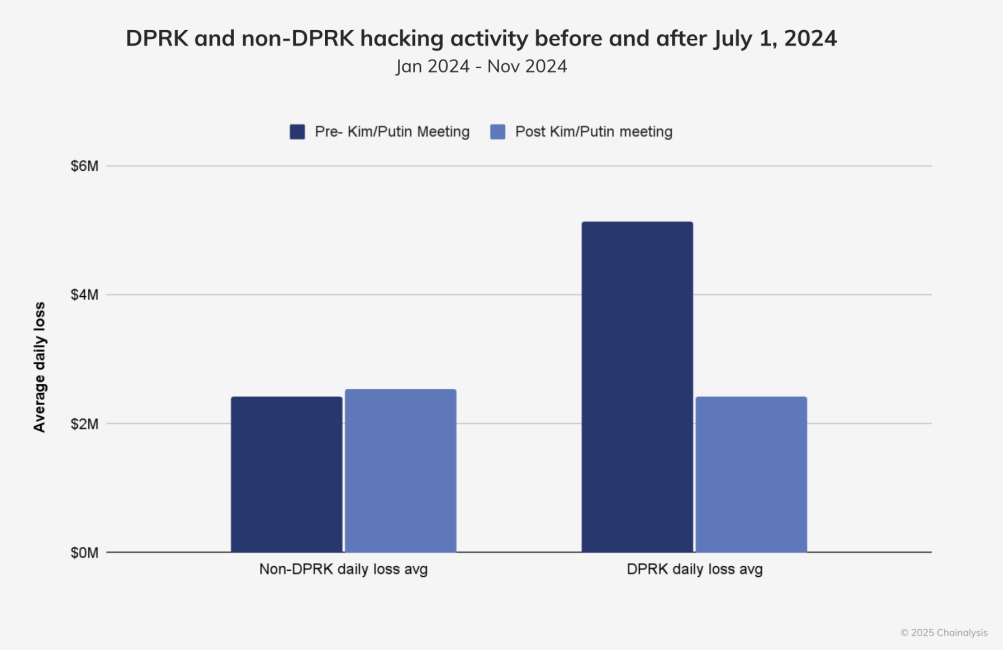 Согласно данным фирмы аналитики блокчейн Chainalysis, нелегальная деятельность, связанная с северокорейскими кибер-преступниками, резко снизилась после 1 июля 2024 года, несмотря на всплеск атак в начале года.