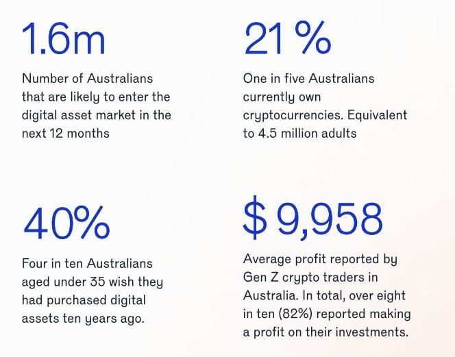 В целом, 78% австралийских пользователей криптовалют сообщили о получении прибыли от своей торговой деятельности за последний год.