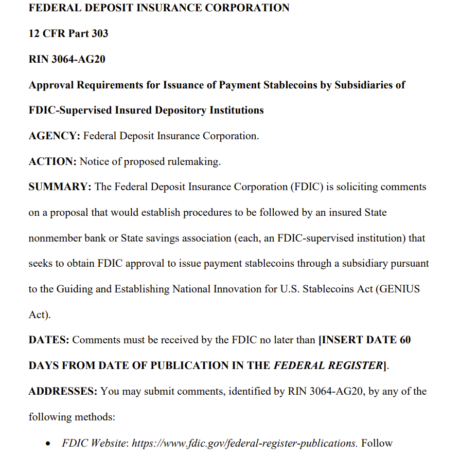 На этой неделе Федеральная корпорация по страхованию депозитов (FDIC), агентство США, контролирующее безопасность банков и страхующее депозиты, представила предложенную структуру, в рамках которой застрахованные банки через дочерние компании могут получать разрешение на выпуск платежных стейблкойнов в соответствии с Законом GENIUS, что может изменить правила выпуска цифровых долларов.
