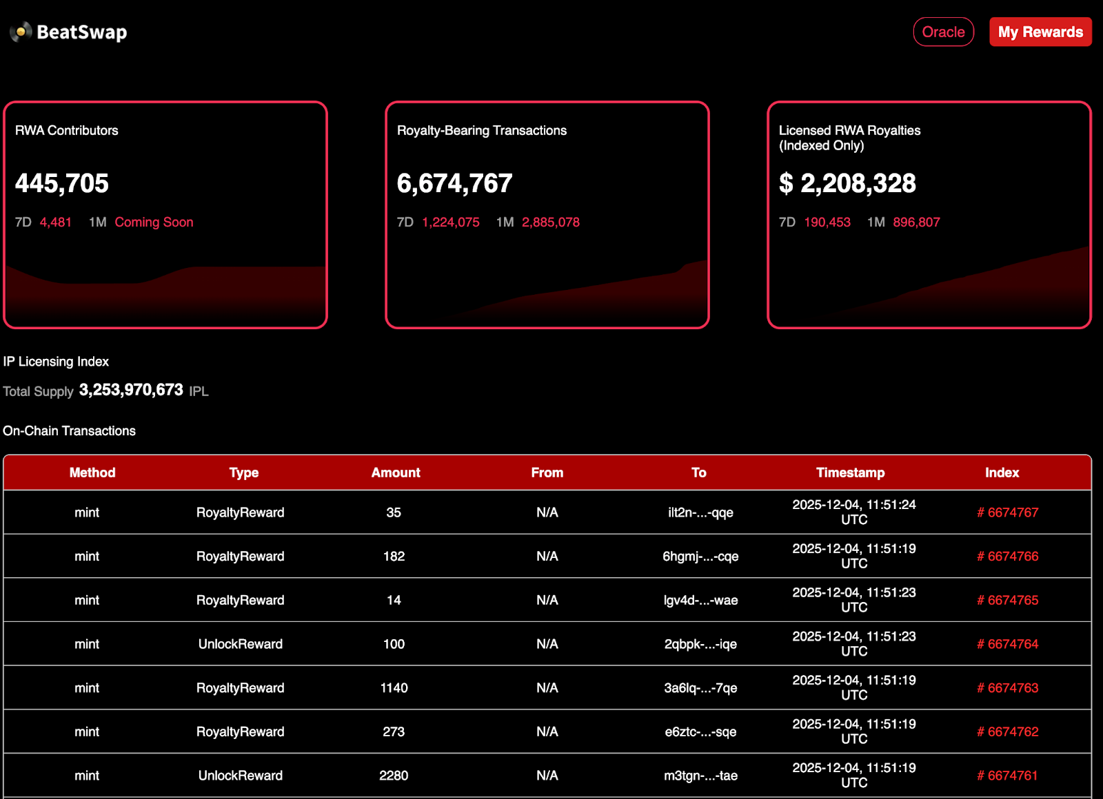 BeatSwap — это комплексная инфраструктура Web3, позволяющая создателям регистрировать и токенизировать права на ИС через свою архитектуру RWA-Launcher. Эти реальные активы (RWA) позволяют владельцам получать роялти от токенизированной работы без участия посредников.