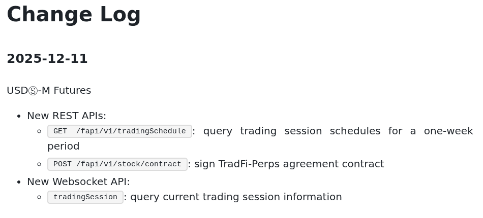 Обновление Binance от 11 декабря сообщает о введении трех новых конечных точек API, одна из которых, включающая URL с акцией/контрактом, позволяет пользователям "подписать договор о контракте с финансовыми перпетуальными соглашениями". Две другие конечные точки позволяют пользователям запрашивать "расписания торговых сессий на период в одну неделю" или "информацию о текущей торговой сессии".